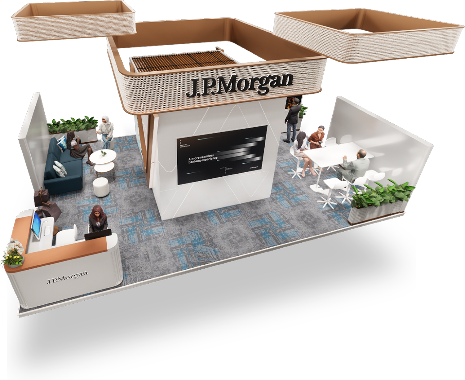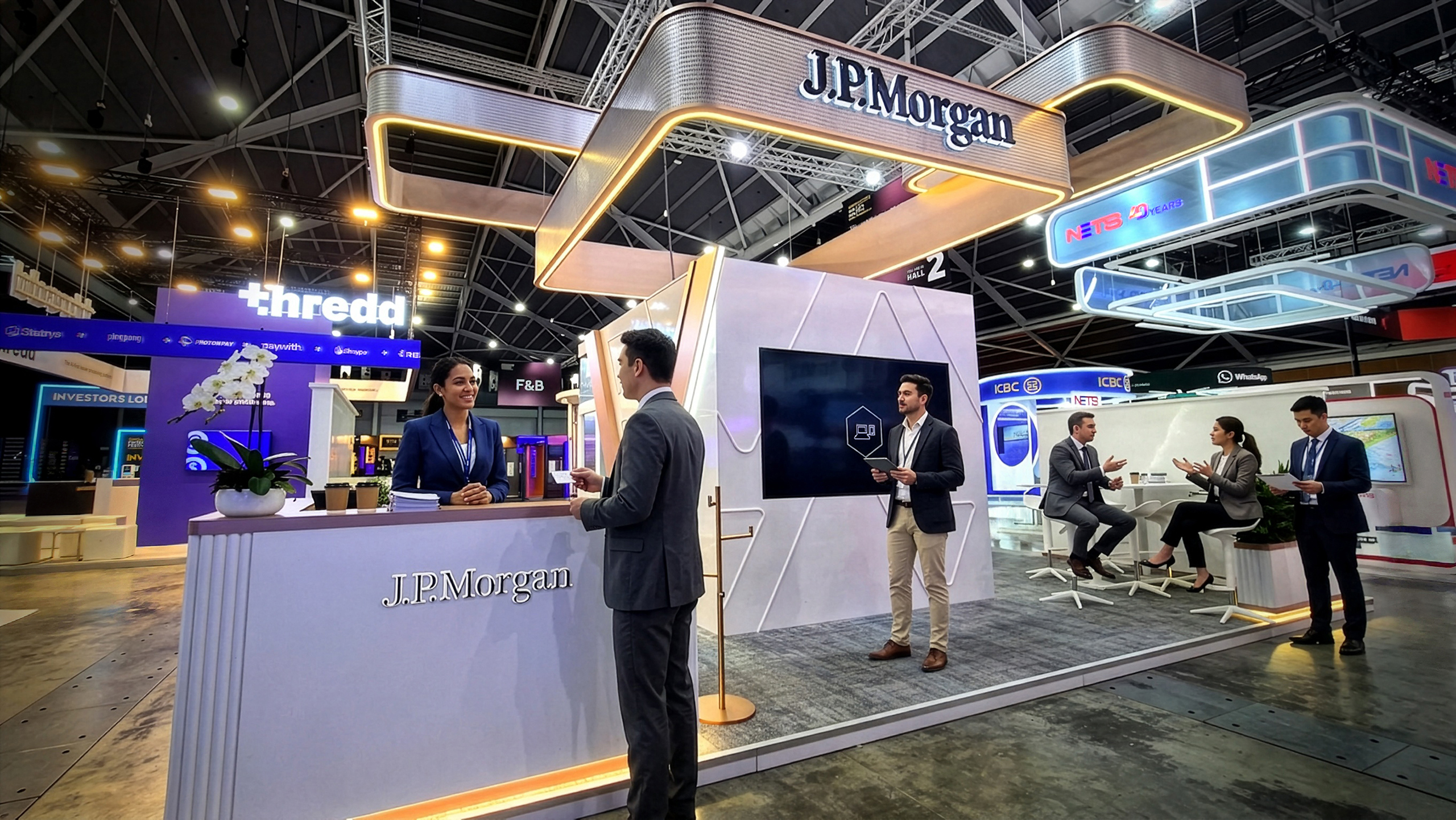 “A refined exhibition booth design for J.P. Morgan at the Singapore FinTech Festival, emphasising a strong and prestigious brand identity.”