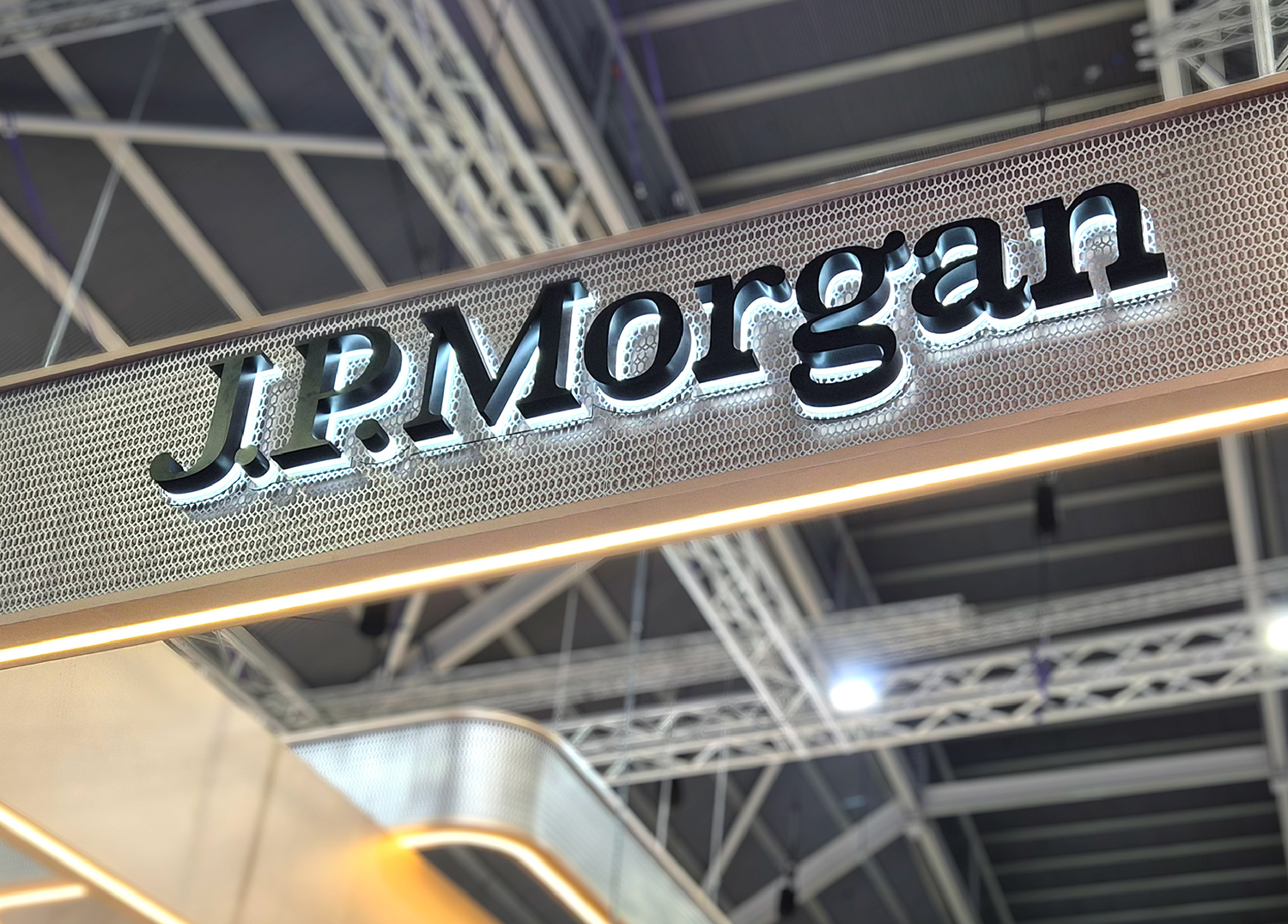 In collaboration with Zodiac Solutions, we developed an exhibition booth design for J.P. Morgan, this exhibition space embodies a sense of prestige and authority through clean architectural lines, refined materials, and a restrained yet powerful lighting language. The elevated overhead structure acts as a beacon—drawing attention while reinforcing brand stature within a competitive event environment.