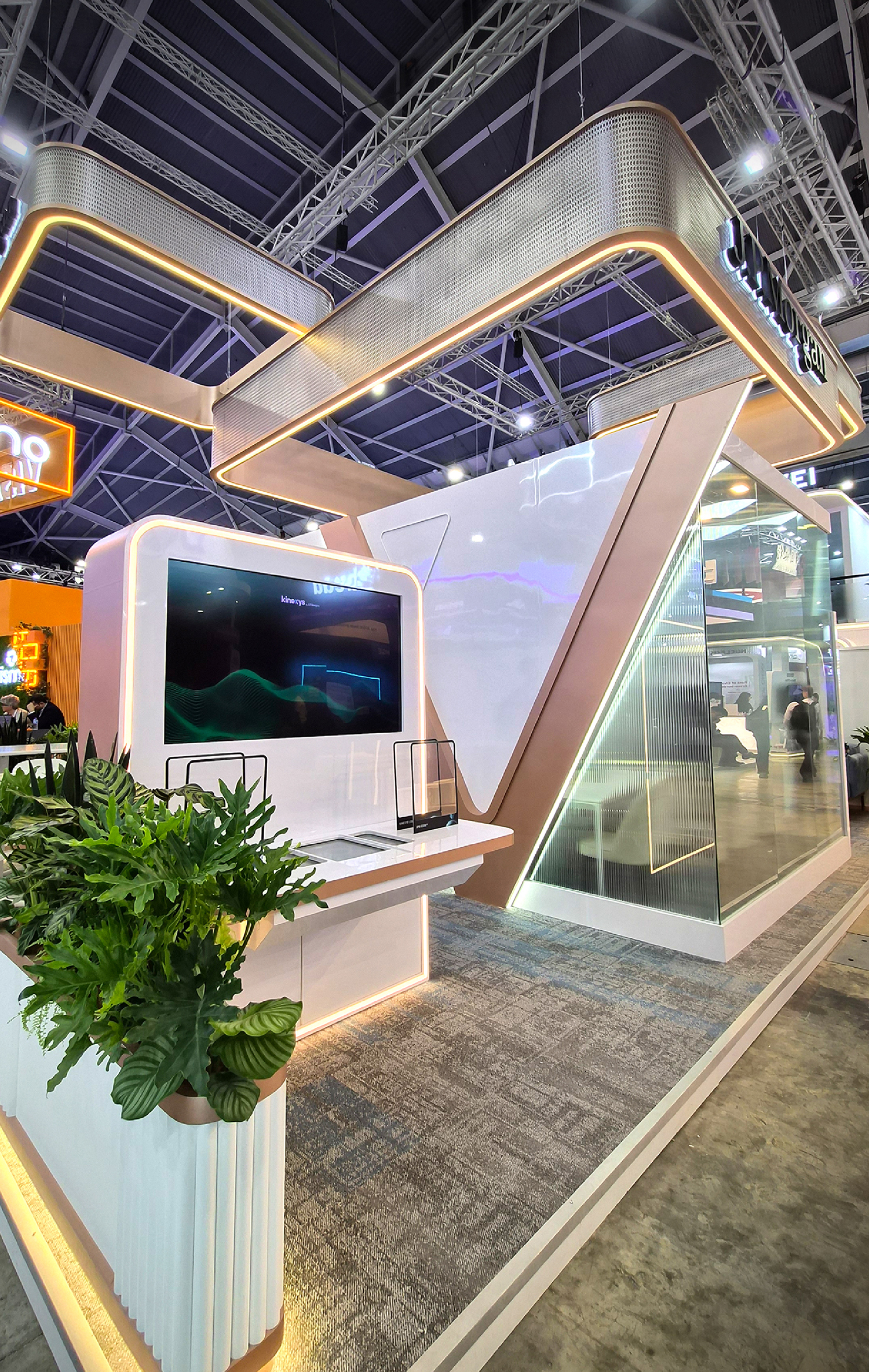 “The booth is designed as an engaging journey, guiding visitors seamlessly from reception into a curated flow of digital touchpoints and conversation zones.”